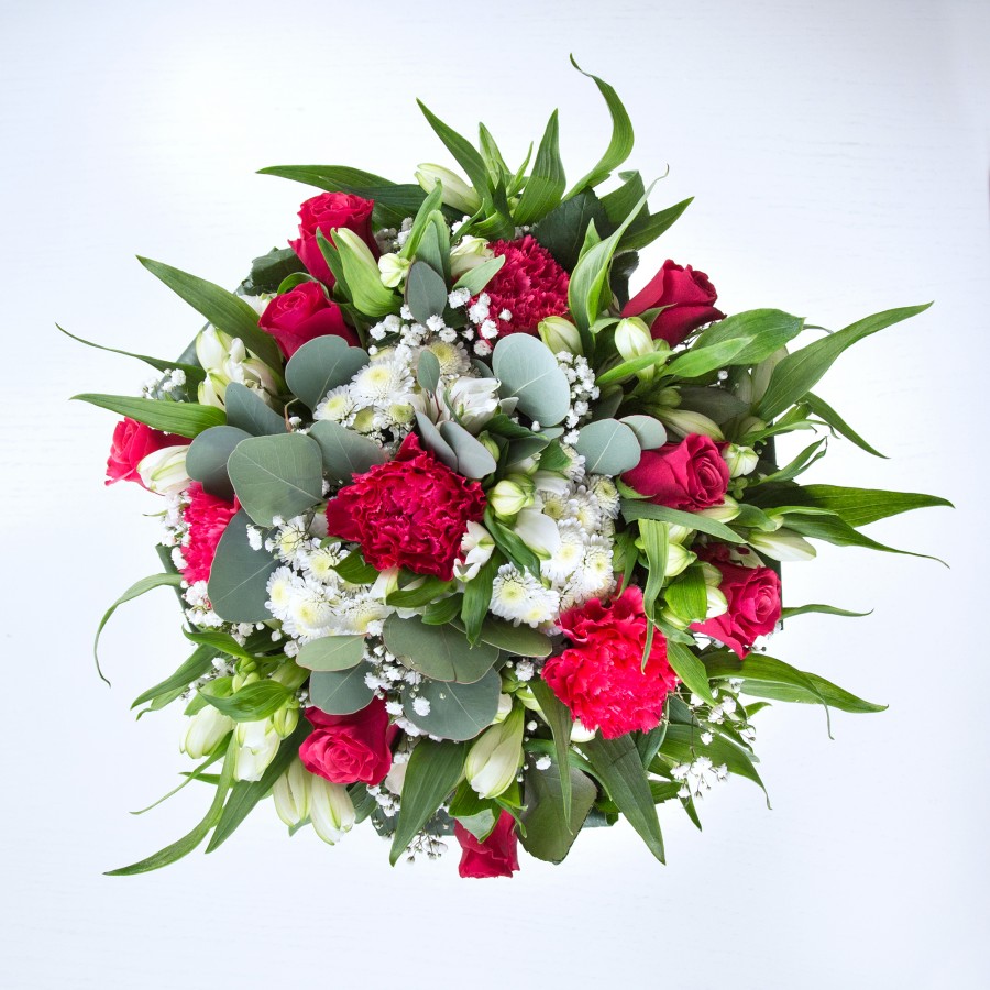 Capture hearts with our enchanting bouquet, beautifully arranged to inspire and delight. This arrangement features luxurious red roses paired with elegant white chrysanthemums and delicate gypsophila.