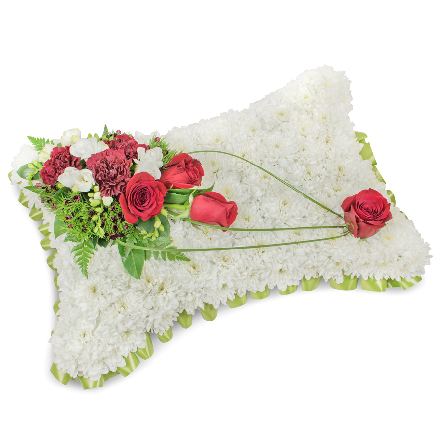 Convey your heartfelt sympathy with our graceful bouquet featuring a delicate mix of white chrysanthemums, red roses, and white freesias. Enhanced with dark red carnations, dianthus, and bear grass, this unique combination radiates elegance and compassion.